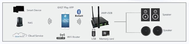 Uygun güce sahip pasif hoparlörlere bağlanan iEAST StreamAmp AMP-i50, geleneksel ses sisteminizi kablosuz hale getirerek kablosuz ses sistemini çok daha rahat bir şekilde kontrol etmenizi sağlar.