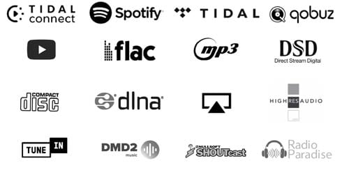 Youtube, Squeezelite, Radio Paradise, Podcast'ler, Pandora, Fusion DSP, Roon Bridge, Soundcloud, Mixcloud